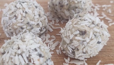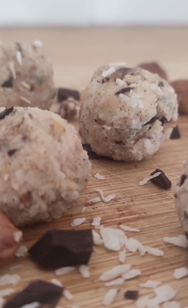 Valeurs nutritionnelles / ball (pour 7 balls) : Kcal : 129 / Protéines : 2.6 g / Lipides : 10 g / Sucres : 5 g / Fibres : 2.6 g